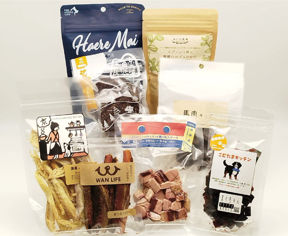 おやつはできるだけ安心・安全なものを与えたいもの。厳選されたお魚・お肉など、素材をそのまま加工してあるジャーキーや、さまざまなおやつをご用意しています。もちろん試食もOK。アレルギー体質で食べられる食材に制限がある場合でも、食べれるおやつを探すことができますよ。