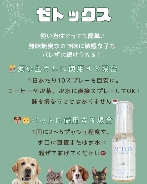 そこで活躍するのが、飼い主さんもペットも一緒に使えるデトックス対策アイテム【ゼトックス】!