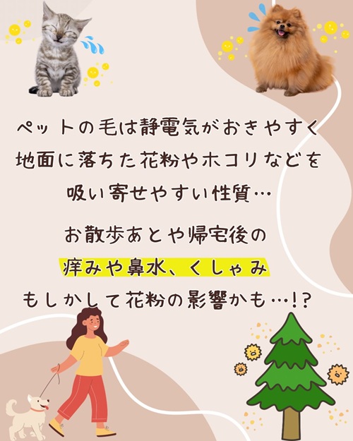 ペットの毛は静電気がおきやすく、地面に落ちた花粉やホコリなどを吸い寄せやすい性質が…。
